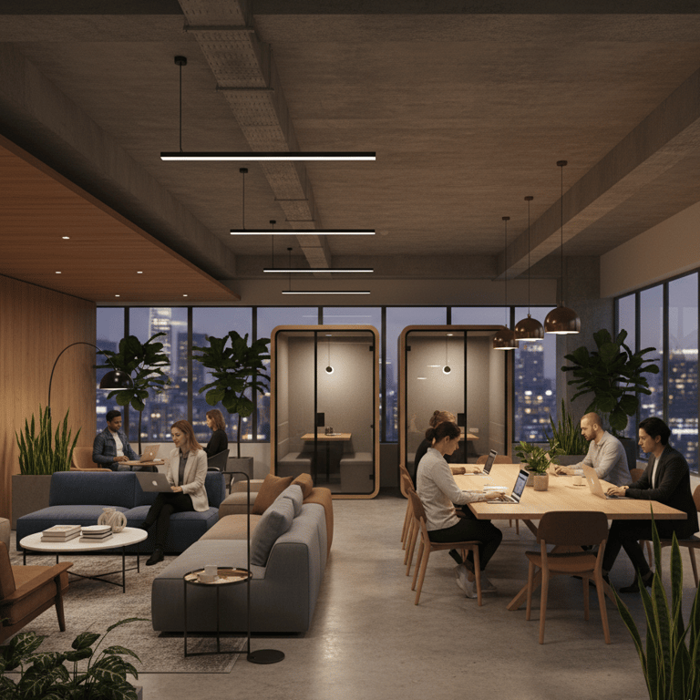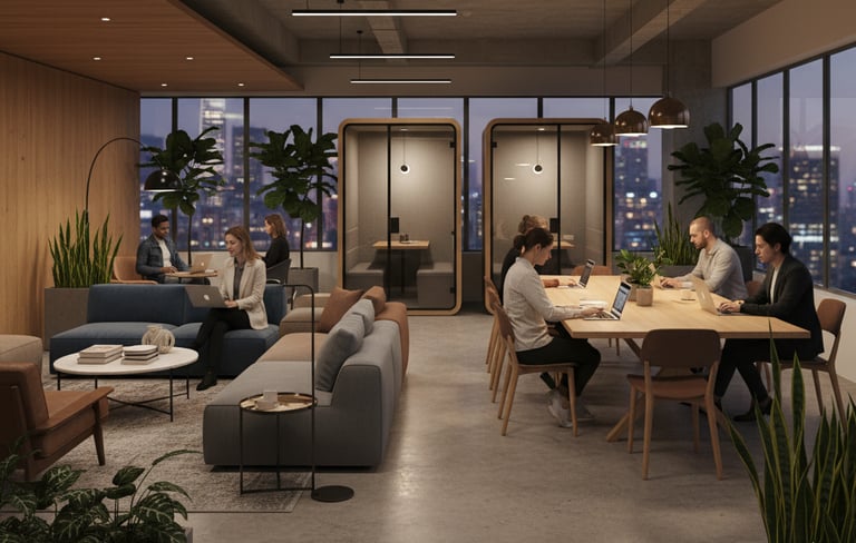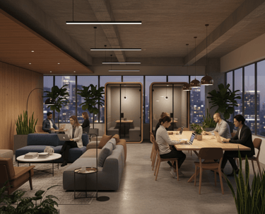 Soluções modernas com foco em colaboração, ambientes multiuso e espaços adaptáveis ao fluxo de trabalho