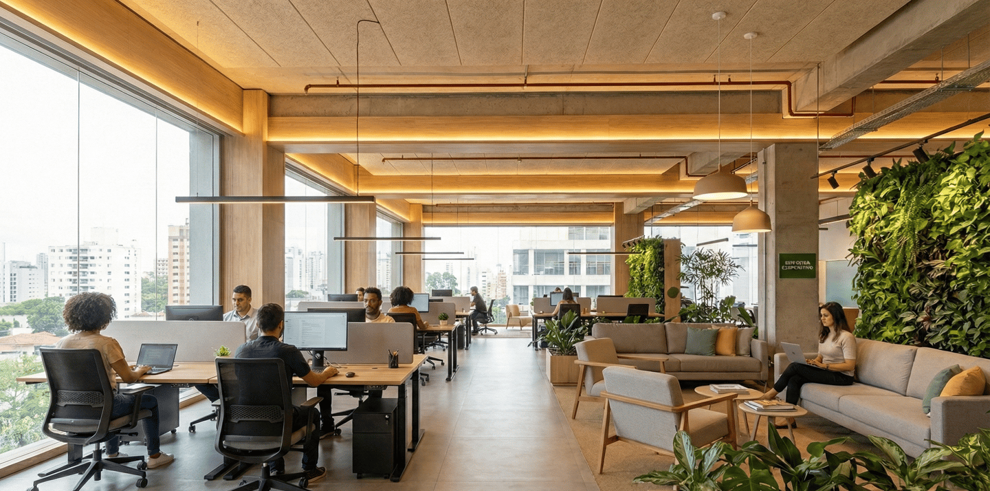 O Studio Âmbito atua com arquitetura corporativa voltada a modelos flexíveis, integrando layout, operação e viabilidade legal.