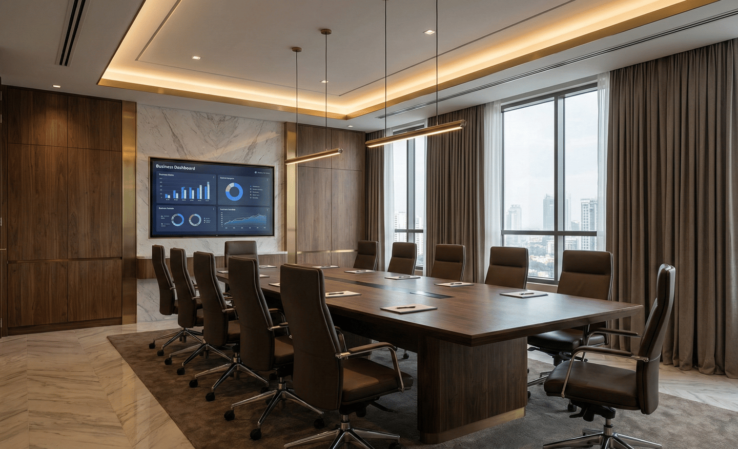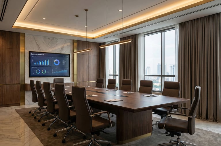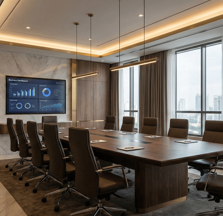 No Studio Âmbito, os projetos para salas estratégicas e áreas corporativas incluem análise técnica completa de: